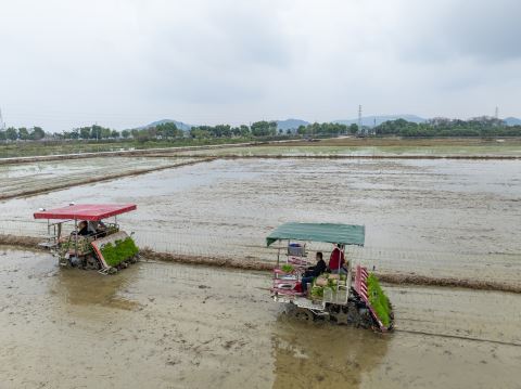 与会人员先后实地察看棉湖镇甲埔村春耕备耕现场(见图。郑楚藩 摄)、水稻集中育秧中心,详细了解水稻新品种、新技术推广,以及无人机施肥喷药、机械插秧等农机作业情况。