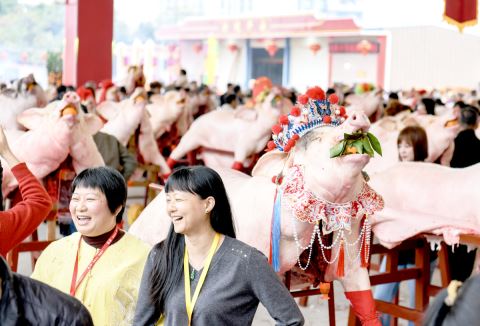 200多头经过精心装扮的公猪、公羊口含大橘,呈奔跃状置于“卉”字形木架上,场面蔚为壮观。