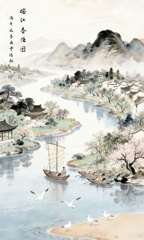 “惟有白鸥沙碛外,忘机先已识行藏。” 尾联收得极妙,余韵悠长。前面写了园林、野航、春风、青山,还有文人雅趣,到最后,却把目光投向了沙碛外的白鸥。白鸥是隐士的知音,陶渊明笔下的飞鸟,“望云惭高鸟,临水愧游鱼”,那是对自由的向往。而蔡同高笔下的白鸥,更通人意。“忘机”二字,是说心无俗念,与世无争。这白鸥,早已看透了诗人的“行藏”——行,是泛舟江上,赏春观景;藏,是心怀丘壑,不慕荣利。人在尘世,总有诸多牵绊,可在榕江的春景里,在白鸥的目光里,所有的机心都能放下。王维说“海鸥何事更相疑”,只因心有忘机,方能与鸥鸟相亲。诗人在榕江之上,与白鸥相视一笑,便知彼此,这便是人与自然的相融,也是文人最向往的境界。