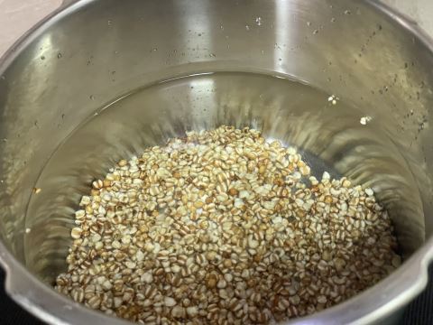 预处理完成后进入炖煮环节,将炒好的薏米放入高压锅,一次性加足量清水,上汽后转小火压10分钟,煮出薏米绵密的基础口感;待高压锅自然下气后开盖,放入泡好的莲子、干百合和西米,不盖紧高压阀,继续用小火煮10分钟,这样能让西米煮透不粘连,百合和莲子也能煮至软糯却不烂,保留食材本身的形态和口感。