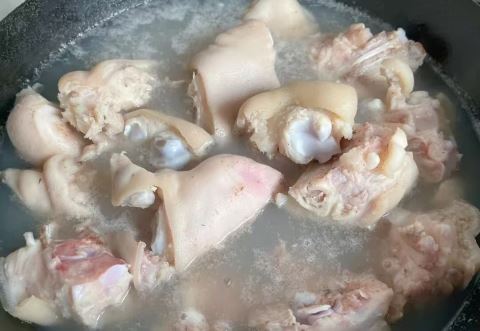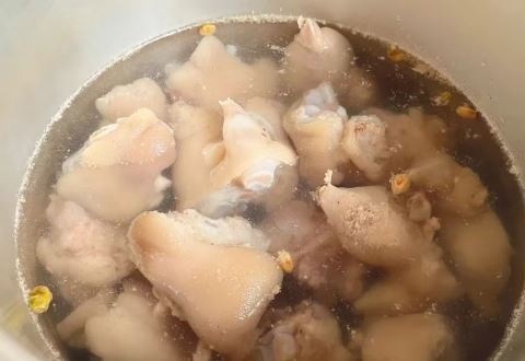 1.猪蹄洗净放入锅中,加适量清水大火煮开,撇净浮沫后捞出,用温水冲洗干净,放入压力锅;
