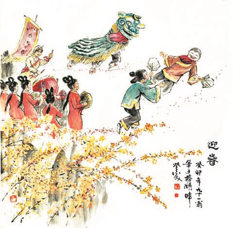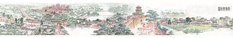 我们生活中充满节日的气息:春节舞龙舞狮、跳英歌舞、庙会,元宵“营”灯笼,端午赛龙舟,中秋赏月,以及娶嫁等。在绘画“我们的节日”时,随着越画越多,便思考如何让这些画面更具连贯性。于是,我以长卷的形式来承载这些内容,结合四季时年节气并融入潮汕特有的民俗活动和标志性建筑。以再现“营老爷”这一民俗活动为例,我跟着队伍,感受现场氛围。画中有谯楼晓角、学宫、榕江书院、桑浦山,还结合旧版《揭阳县志》等资料和儿时榕城的记忆,将城墙窖门、衙前牌坊、池塘水系、南浦渔歌、古木帆船、传统作坊、老铺墟市等入画,把古城的传统建筑民居、民俗文化活动、民生劳作贸易和市井百态融于一卷,创作52.3米的民俗国画长卷《揭岭春秋图》。透过画作,昔日场景生动再现,让人们感受这是我们生活过的故土,这是我们记忆里的家乡。