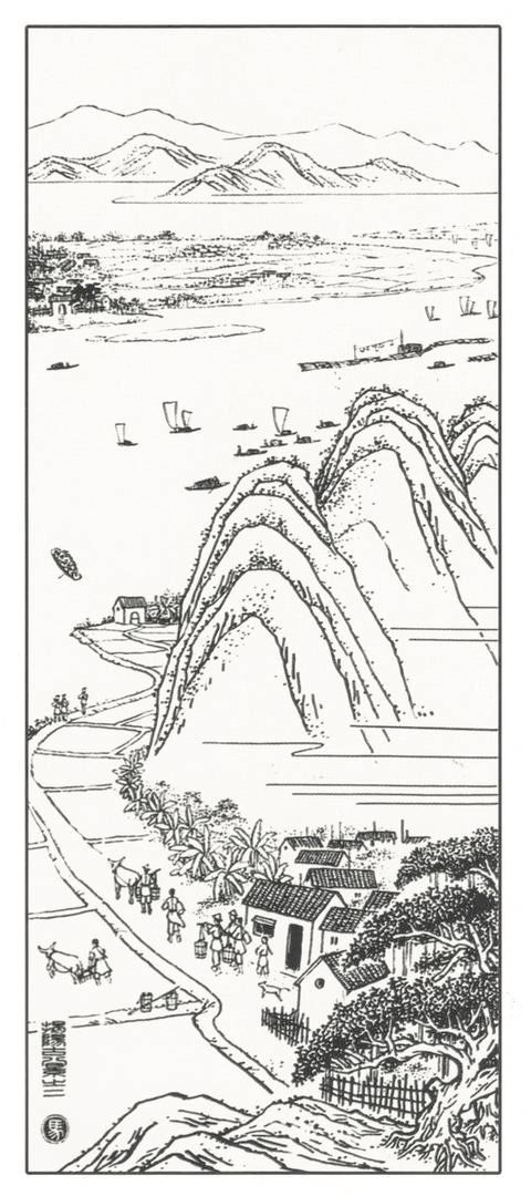 基于这一理念,我尝试用多种美术形式表现家乡揭阳,于是创作连环画系列《揭阳名胜传说录》,包含“揭阳岭的由来”“浮水莲花”“揭阳古八景”“车公桥”等揭阳名胜典故与民间传说。创作时依据场景、人物,运用平、仰、俯,近、中、远多种视角,以及特写、重构、夸张手法突出主题,增强表现力;采用白描、装饰画、剪纸、砖刻等多种艺术形式,彰显地方文化历史底蕴。