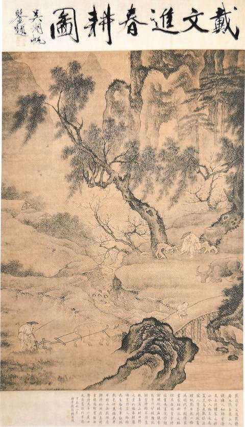 明代画家戴进(1388~1462),字文进,号静庵,又号玉泉山人,浙江钱塘(今杭州)人,绘画风格多样,又具独创性,擅长山水、人物,花鸟亦佳,是明代一位重要画家,在画史上被称作“浙派”的开创者。他在山水画方面,善于描绘村桥野店、乡居渔村、樵夫牧子等社会生活场景,用大众视野表现生活中的真实感受,且画风纵意豪放,自出新意。他的《春耕图》不仅诠释了当时的春耕场景,也是其绘画艺术风格展现的一个缩影。