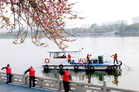 3月21日,在四川省眉山市东坡区东坡湖,志愿者和环卫工人在进行湖面清漂作业。