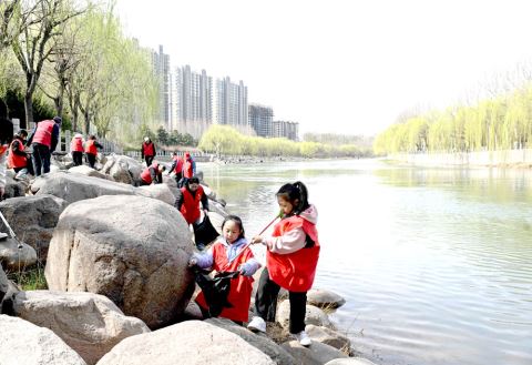 3月22日,小志愿者在河北省石家庄市新华区太平河畔捡拾垃圾。 新华社 发