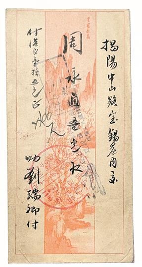 右下角的宣传戳“欢迎华侨投资建设伟大祖国”,配以图案并刻“揭阳人民银行”字样,则是上世纪50年代动员侨汇支援国家建设的生动写照。这段时间的宣传条形章时有所见,但都是不带图案和不刻单位名称 ,带图案并配刻上“揭阳人民银行 ”的,显然并不多见,给人以耳目—新之感。而且一个批封同时出现两家银行名称章戳的也较少见,为研究当时侨务政策提供了直观素材。