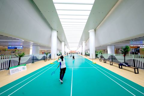 3月18日,在深圳地铁黄木岗站内的羽毛球场,市民在打羽毛球。