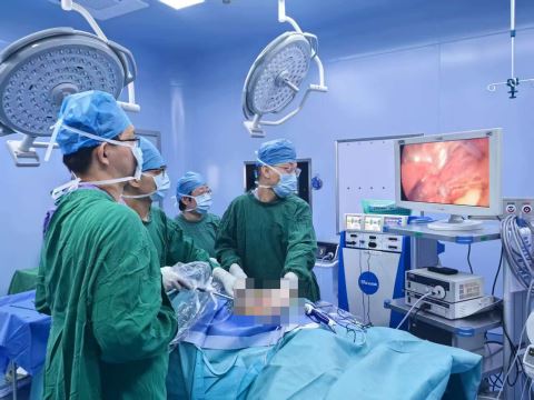 图为郑远教授(左一)正在为患者施行胸腔镜下肺叶切除手术。通讯员 摄