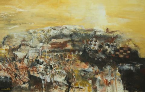 在玉怀早年创作过的一些抽象水彩作品《天地·记》《浮山云影》等系列作品中,我们看到他的画面走出了传统水彩语言与技法手段,更大胆运用水与色,用土黄或赤褐这些来自土地及枯黄植物的色彩,营造出浑沌深厚的色调,体现他内心对土地深沉的情感基调,直接以色彩能量与观众达成视角共鸣,突破对写实具象形象承载,并直接采用非三维空间逻辑的自由视角构图,去俯视描述他生存生活的那片土地,让人们用很高更远的视角去抽离的观看。
