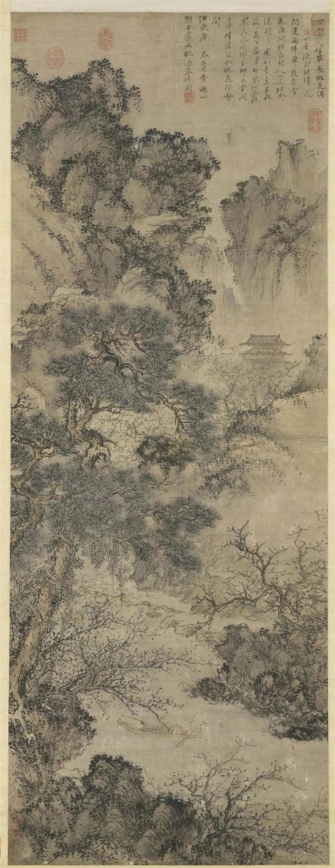 《桃源春晓图》以陶渊明《桃花源记》为蓝本,将那片世外桃源的绝美之景生动地呈现在观者眼前。画面上,一位渔郎撑着短棹,悠然自得在江上徐行。江水两岸,桃花齐绽,灼灼其华,宛如天边的云霞飘落人间。花瓣或三五一簇,或独自绽放,在微风中轻轻摇曳,仿佛在诉说着春天的故事。远山叠嶂,层峦起伏,山体以解索皴与牛毛皴交错勾勒,线条细劲繁密,如发丝般层层叠加,表现出山石的纹理与质感。山头苔点繁密,或聚或散,用干、湿、浓、淡不同的墨色点染,既丰富了画面层次,也点活了春山的生机。山谷间,云雾缭绕,仿佛给这桃源世界蒙上了一层神秘的面纱。隐约可见的楼阁,增添了仙境的神秘感,让人不禁遐想,那楼阁之中是否住着避世的仙人。山谷之间还点缀着几处茅屋,若隐若现,展现出隐逸生活的宁静与闲适。