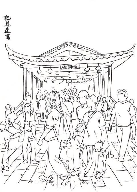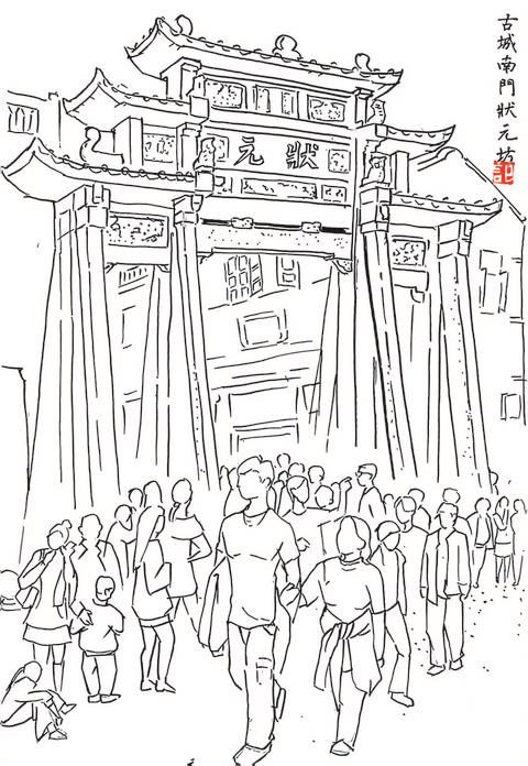 丙午大年初一遇春雨,我独自撑伞逛揭阳古城,满城古韵扑面而来。即便细雨纷纷,古城依旧游人如织。更令人欣喜的是,今年的揭阳古城焕然一新,环境整洁,已然成为新晋网红打卡地。漫步中山路,见街上人头攒动、热闹非凡,我顿时萌生了速写的念头,当即拿出手机拍照取景。从进贤门到中山骑楼街、中山公园、禁城、西湖公园每个标志景点,每一处,我都选取了几个典型角度记录下来。归家后,我便执起画笔,以线性速写勾勒出揭阳古城的各处景致,于是就有了这组古城系列速写。 ——叶记恩