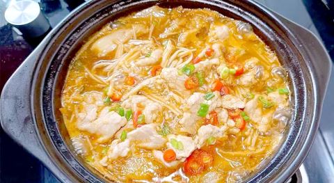 将金针菇、白菜、猪肉三种食材完美地结合在一起,经过精心烹制,各种食材的味道相互渗透、融合,形成了一种独特的鲜香,便成为美味的金针菇白菜猪肉煲。 所需材料 金针菇、猪瘦肉、大白菜。 制作步骤 1.把大白菜清洗干净,用手撕成小块装盘备用。把金针菇老根切掉,放入盐水中浸泡一会儿,去除虫卵和农药残留。 2.把猪瘦肉切成薄片,放入小碗中,依次放入葱姜蒜2勺、胡椒粉1勺、玉米淀粉1勺、香油1勺,搅拌均匀,腌制10分钟。 3.把大蒜、葱、小米辣切末,同时准备一个小碗,加入盐1勺、胡椒粉1勺、生抽2勺、蚝油1勺、鸡精1勺、清水小半碗,搅拌均匀备用。 4.砂锅放入少许油烧热,放入蒜末和葱,开小火炒出香味。再放入番茄酱1勺、大白菜、金针菇和腌制好的肉片。 5.倒入准备好的调料汁和小米辣,盖好盖子,烧开后用小火焖煮5分钟,撒上香葱就可以上桌啦。纪微萍 文/摄 |