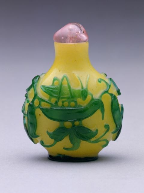 〔清〕黄地套绿玻璃蝈蝈图鼻烟壶