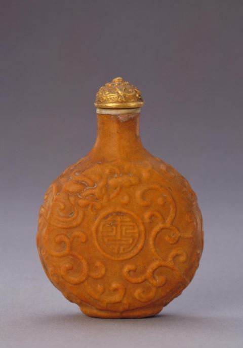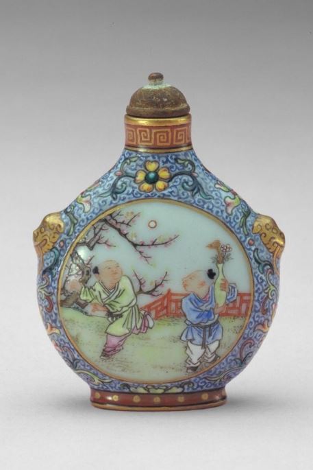 〔清〕粉彩开光婴戏图兽耳瓷鼻烟壶 鼻烟壶的装饰丰富多样,常见的装饰题材包括花卉、人物、风景等。装饰图案如珍禽瑞兽、花鸟鱼虫、山水草木等,这些图案不仅美观,还蕴含着吉祥寓意,如“福禄寿”等文字装饰,增加了鼻烟壶的文化底蕴。 古人还十分在意鼻烟壶的纹饰之美,几乎每一件留传到今天的鼻烟壶纹饰都具有美好的吉祥寓意。传统的瓷鼻烟壶常见松下八仙纹、穿海龙纹、五爪龙蝙蝠纹、三友纹、狮子滚绣球纹、桃花纹、佛手纹、树下梅花鹿纹、喜鹊报春纹、马上平安纹、榴开百子纹、鱼跃龙门纹、蝈蝈纹等吉祥纹饰。如清时期的黄地套绿玻璃蝈蝈图鼻烟壶,烟壶鼓腹,平底,粉红色碧玺盖,下连象牙匙。壶体为黄色玻璃,外套以饰豆荚蝈蝈图的绿色玻璃。套玻璃鼻烟壶是玻璃鼻烟壶中的一个主要品种。这件鼻烟壶黄地套以半透明的绿色玻璃,色彩娇嫩柔和,黄如鸡油,绿如翡翠,无论构图、色彩或工艺,都堪称清代中期玻璃鼻烟壶中之杰作。常见的还有荷花青蛙纹、牛羊纹、螭龙纹、缠枝葫芦纹、荷花翠鸟纹、三阳开泰纹、携琴出游纹、云龙纹、婴戏纹、教子图等吉祥纹饰。如粉彩开光婴戏图兽耳瓷鼻烟壶,烟壶呈扁圆体,细颈配铜镀金圆盖,下连铜镀金勺。颈部饰勾金回纹一周,肩两侧对称兽面衔环耳装饰。通体饰珐琅彩轧道西蕃莲花,正面为圆形开光,内绘婴戏图,儿童神形描绘生动自然,画工精细。椭圆形足,足墙一周以金彩绘鼓钉12个。此壶造型规整,胎质细腻,图案纹样清晰,整个画面使用了红、粉、绿、黄、金等色,色彩丰富,浓淡相宜,恰到好处。尤其是粉彩、珐琅彩并用,使烟壶愈显珍贵。 当时人们不满足于纹饰对吉祥的寄予,甚至直接在壶面写福、禄、寿、喜、如意等吉语文字。如匏制螭寿纹鼻烟壶,鼻烟壶扁圆体,直口,细颈,溜肩,椭圆式带状扁足。口沿嵌象牙口一道,两侧肩胁部饰卷草纹,壶身正背两面中央均为篆书团寿字,斜上方一螭探身窥伺,身如蔓草,宛转流利,环绕一周,神态生动。此鼻烟壶纹饰饱满圆润,汇聚处凸起似珠,极富装饰意味。上配铜镀金錾刻宝相花盖,下连牙匙。金属盖与洁白的牙口及深红的匏壶形成了色泽与质地的鲜明对比,相映成趣。 艺 辑