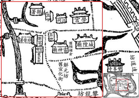 清乾隆《揭阳县志》城坊图中的“解元坊”。阿 龙 截图 店马地域,秦汉时期属古揭阳县管辖。东晋咸和六年(331),将揭阳县分设为海阳、潮阳、海宁和绥安4县,店马地域属海阳县。南宋绍兴八年(1138)复置揭阳县,店马地域位居揭阳县渔湖都极西地区,为玉窖村所在地。绍兴十年(1140),县治定于玉窖村,店马地域遂成为新县城中心地带,县署临时办公地设于玉窖村地势最高的地方,称高地,在建成街区后,当地群众乃将之字形的小巷命名为高地巷。县治迁来的当年,随即在高地东侧兴建学宫。 玉窖村原为一个渔村,村里当有集市。在设为新县城之后,县署前和学宫前就逐渐热闹起来,来县署前和学宫前摆摊设点做生意的增多,不久就形成县城的一个重要集市,学宫前的大街,就被市民称为学前街,而县署前的大街,因有诸多的店铺做生意,便被称为店街。尔后,店街往西拓展,一批批店铺在大街南北两侧建起,较大的店铺有顷丝坊,市民因此称为顷丝街。再往后,顷丝街直抵玉窖溪,架设新桥通打铜街,因是店街向西延伸至玉窖溪的大街,人们便将其称为新街,新架设的桥也因此被称为新街桥。 清乾隆《揭阳县志》“城坊街巷”载县城12条街巷中,有学前街和新街,但没有店街。推断起来,当是来到清代,学前街的名气较大,店街被涵盖到里头去了。但即便没有把店街记载在县志里头,市民还是口口相传店街的名字,直至民国年间。 学前街、店街和新街,作为宋元明时期揭阳县城最早建成的东西走向街路,原宽2~4米不一。1928年,店街与学前街扩筑为宽10米道路后,合并改名为店马路。新街同一时间也扩筑为宽10.35米道路,同样改名为新马路。 20世纪五六十年代,进贤门至学宫前的店马路东段,将南侧的高厝池溪填为下水道,将路面扩筑为宽18米的混凝土路,并重新命名为进贤门路。 2002年,揭阳市政府重新命名一批市政道路,将进贤门路、店马路和新马路合并,命名为思贤路。思贤路的东段,为永革和东门社区分界线,中、西段则为店马社区辖域。 揭阳县城的中心区域 自南宋绍兴十年(1140)县城落址玉窖村开始,店马地域就是县城的中心区域。 依历史上大多县城的建设惯例,一旦设为县城之后,就会筑起城墙,并至少有东西南北4个城门的建造。据1990年《榕城镇志》载:“至元十五年(1278,即南宋端宗景炎三年),文天祥率宋军奔榕城,元兵穷追至此。民助文抗击。城破,元兵毁学宫,纵火焚城,屠杀3日,尸积如山,全城仅存6户8人。”从“城破”“焚城”的叙述看来,南宋揭阳县城当筑建有城墙的,城墙毁于宋末元初。 元初政局稳定后,统治者重建了城墙,据清乾隆《揭阳县志》载:至正十二年(1352),县治筑土城周800余丈,环县衙建内石城(即今禁城——本系列第26站有详述)周200丈。 依这个记载,至元代形成的周800余丈,便是其时的城区规模。这个规模究竟从哪儿到哪儿呢?地方史书没有载述,但因为禁城从元代至今,区域保留得较为完整,内城“周200丈”和土城“周800余丈”的数据,正好让我们可以测算出土城的大致范围:内城和土城其实就如两个同心圆,县城辖域就于土城之内,县署范围则在内城之中。外圆周长比内圆周长多4倍,外圆的半径为127.4丈,而内圆的半径则为31.8丈,这个同心圆的外圆半径就只在内圆半径上向外延伸出95.6丈,也即只多出两倍距离而已。照这样的半径推断,元代土城墙内的范围,大致就是沟仔墘街-北马路-东风河-城隍路-玉窖溪围起来的范围。而这个范围,就是今天的中山街道中心地带(可回看本系列第43站“中山街道”)。这个范围,大概今店马社区占了2/3,永革社区占了1/3. 2024年孙昌麒麟著《玉带萦瓠——揭阳古城形态深化》一书,推算了元代城墙位置,大致与我们的推算接近,只是东城墙在学宫东侧,而没有延伸至东护城河。 明太祖洪武元年(1368),明朝建立后,政局趋稳,揭阳县城人口逐渐增多,经过近百年的繁衍生殖,迁入县城定居的人越来越多,县城也向东西南北4个方向拓展。天顺五年(1461),县城重垒起新城墙。这次垒筑起来城墙,奠定了县城近500年的城市格局,基本上就是民国二十七年(1938)拆除城墙后形成的环城路范围。 清初,县城人口增多,统治者将县城划为7坊,建立起基层管理机构。店马地域,建为解元坊。据1990年《榕城镇志》载:顺治朝(1644~1661)初叶,在城建置7坊,计:魁隆、朝天、椿桂、攀龙、解元、魁元、达道。坊的建制,大致类似于今天的社区居委会。 解元坊名字,取自科举制度中乡试第一名“解元”,也多对读书人的通称或尊称。县城7坊所取名字,都有积极向上愿景。 在《榕城镇志》的《清代揭阳在城(榕城)七坊区域及保甲数简表》上,解元坊的管辖区域为:县衙以南至宣化街(今中山路)东桥巷口,学宫前以南高地、巡司巷、起凤亭至店街,及城隍前后、观音仔街至车公桥以南一带。坊址设于城隍前谢家祠,有保甲数42甲(保甲,类似于今居民小区)。据此,解元坊便系县署驻地。 文物密布的文化街区 店马地域,自南宋至1991年,一直为县署(县政府)所在地,因而,一大批重要的文物保护单位,就落在辖域内。 在宋代县署范围内垒起的元代内城墙,600多年来屹立不倒,成为揭阳重要的文物,被列为省级文物保护单位。而禁城内的揭阳县衙旧址,包括红砖楼、考院、中山公园旧址等,也被列为市级文物保护单位。 创建于明洪武二年(1369)的揭阳城隍庙(可回看本系列第224站),是广东省内现存最大规